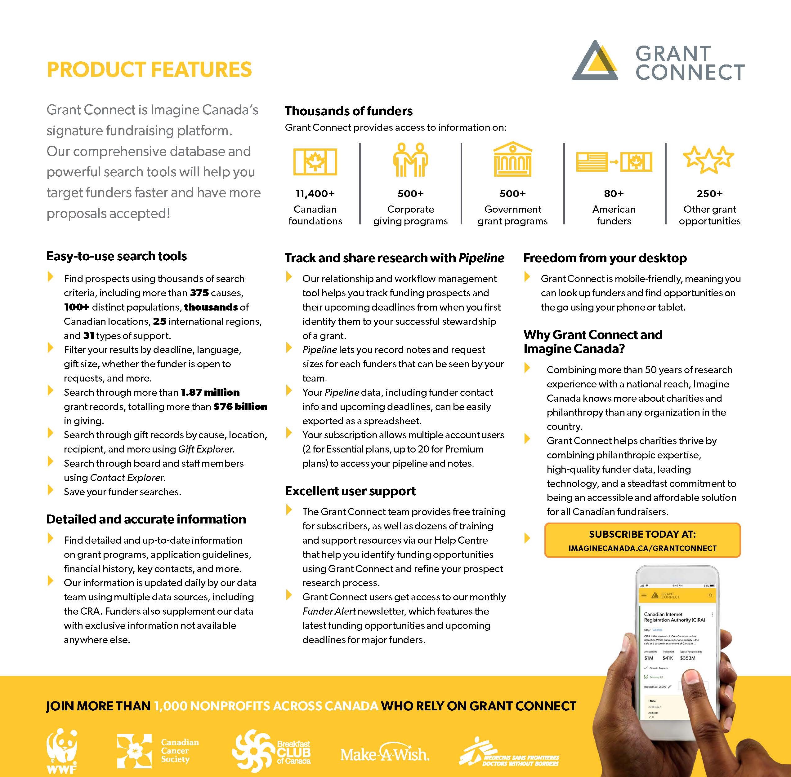 Grant Connect is a comprehensive fundraising research platform that provides access to thousands of Canadian grantmakers, including foundations, government programs, and corporate funders. It is designed to help organizations identify relevant opportunities, understand funder priorities, and plan grant applications with greater precision.